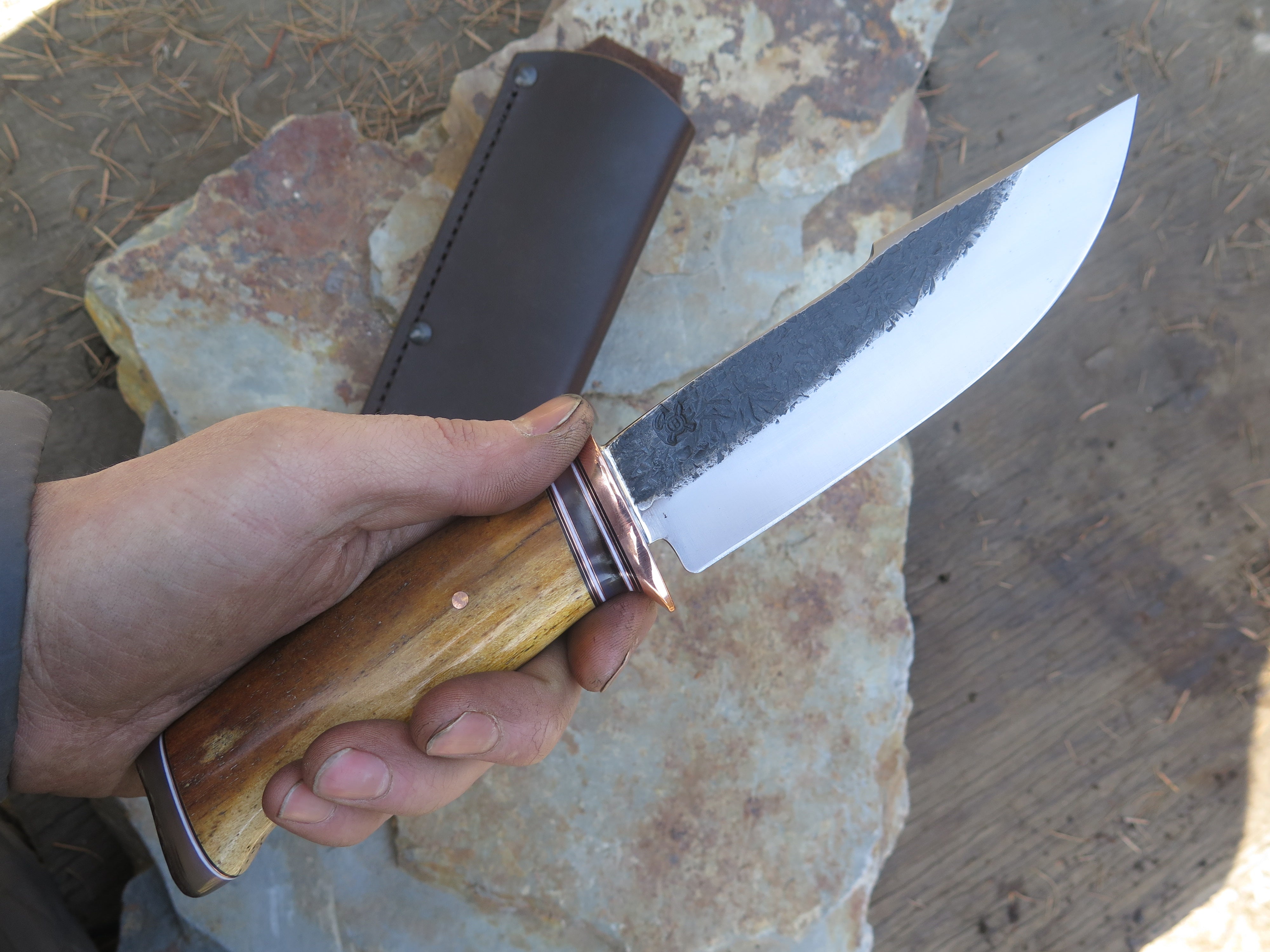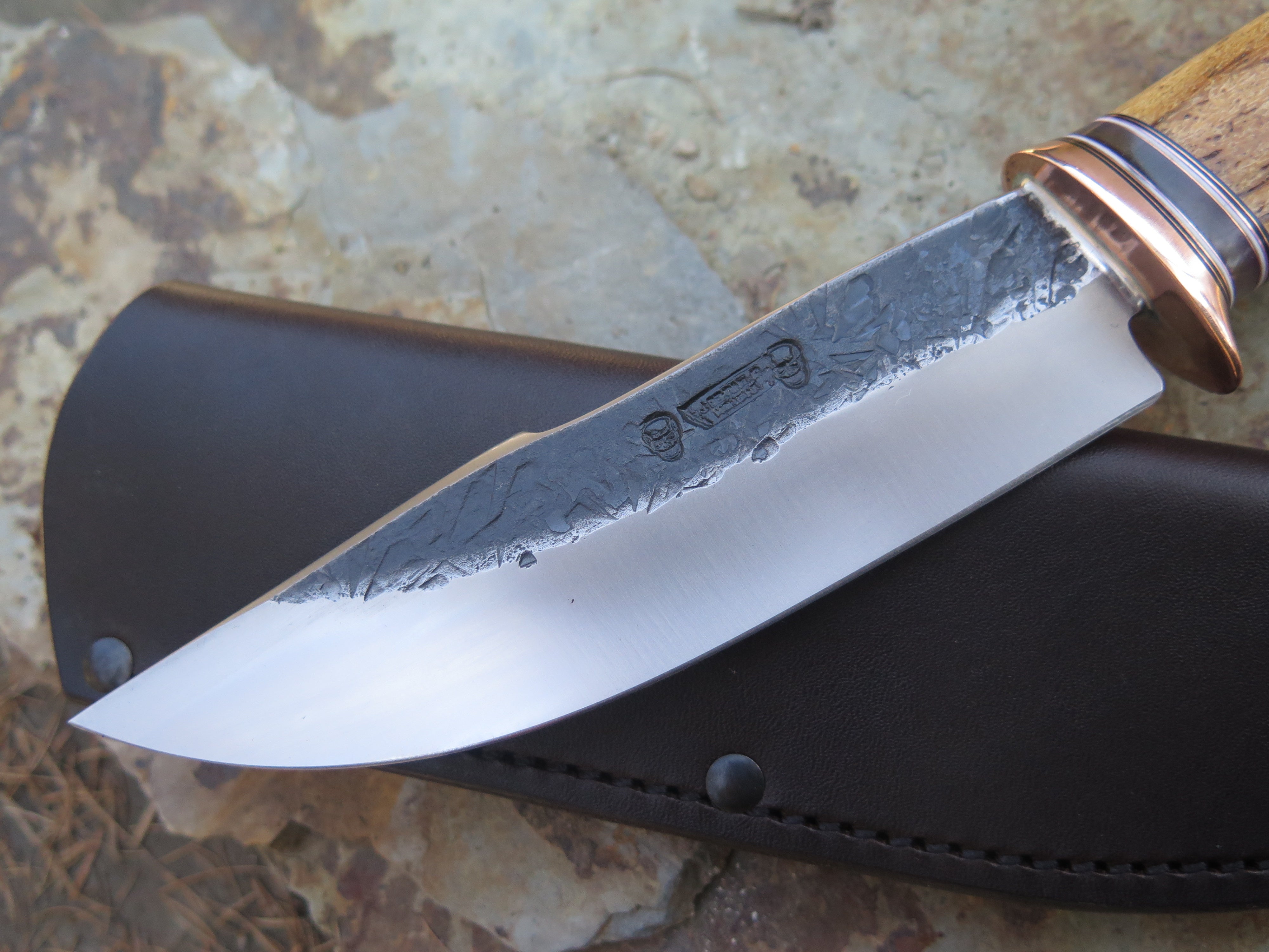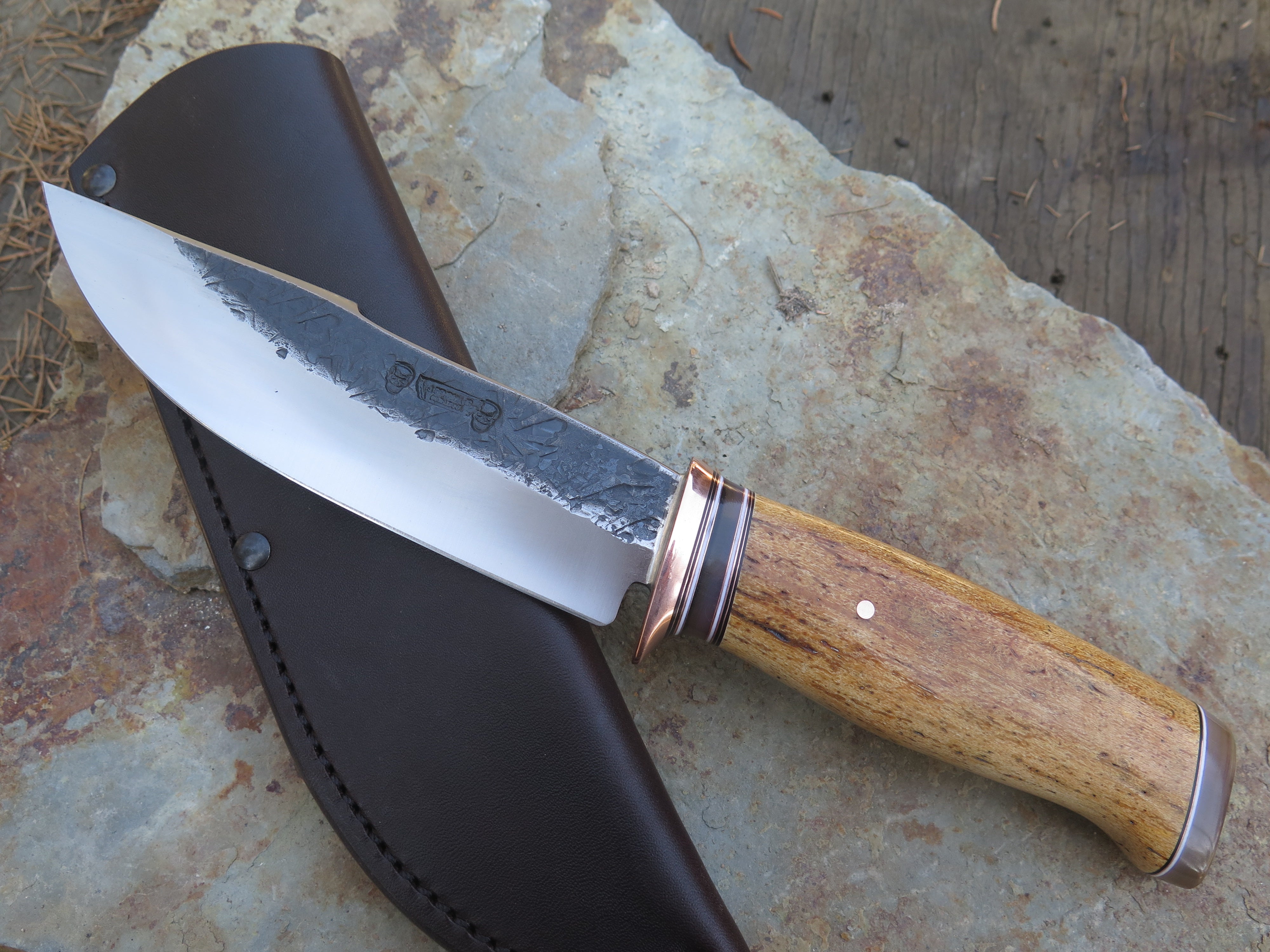 This bad ass new Spearpoint from Behring Made© is hand forged from 13/64" thick 5160 spring steel and it measures 6" from tip to guard with a razor sharp hollow grind and our hammermark finish. The copper guard is soldered in place above black and white fiber, copper and kudu horn spacers with a Stellar's' sea cow rib bone handle that's pinned with copper and capped with kudu as well. Phew! The overall length measures 10 1/2" and this one comes in a classic leather belt pouch sheath.