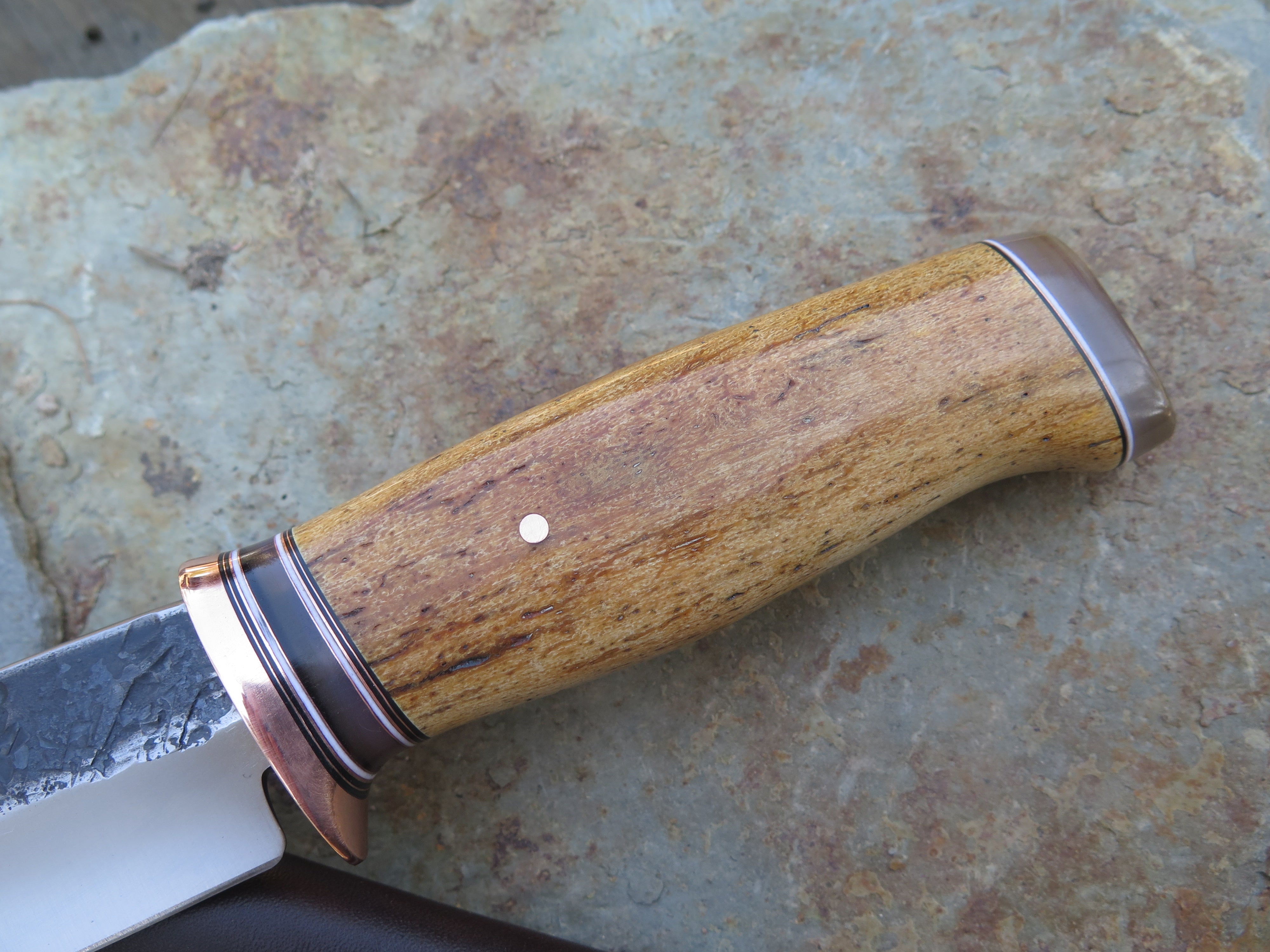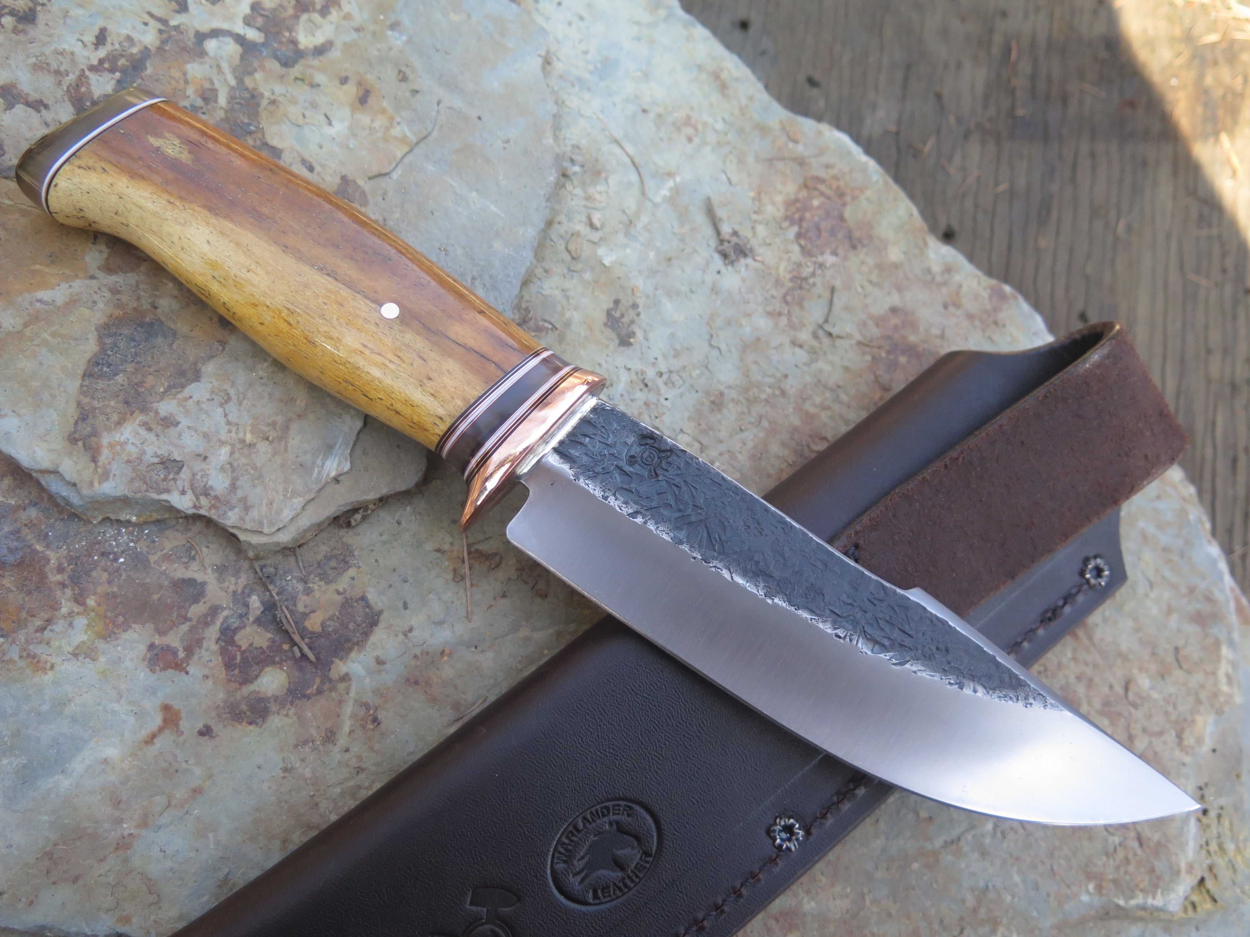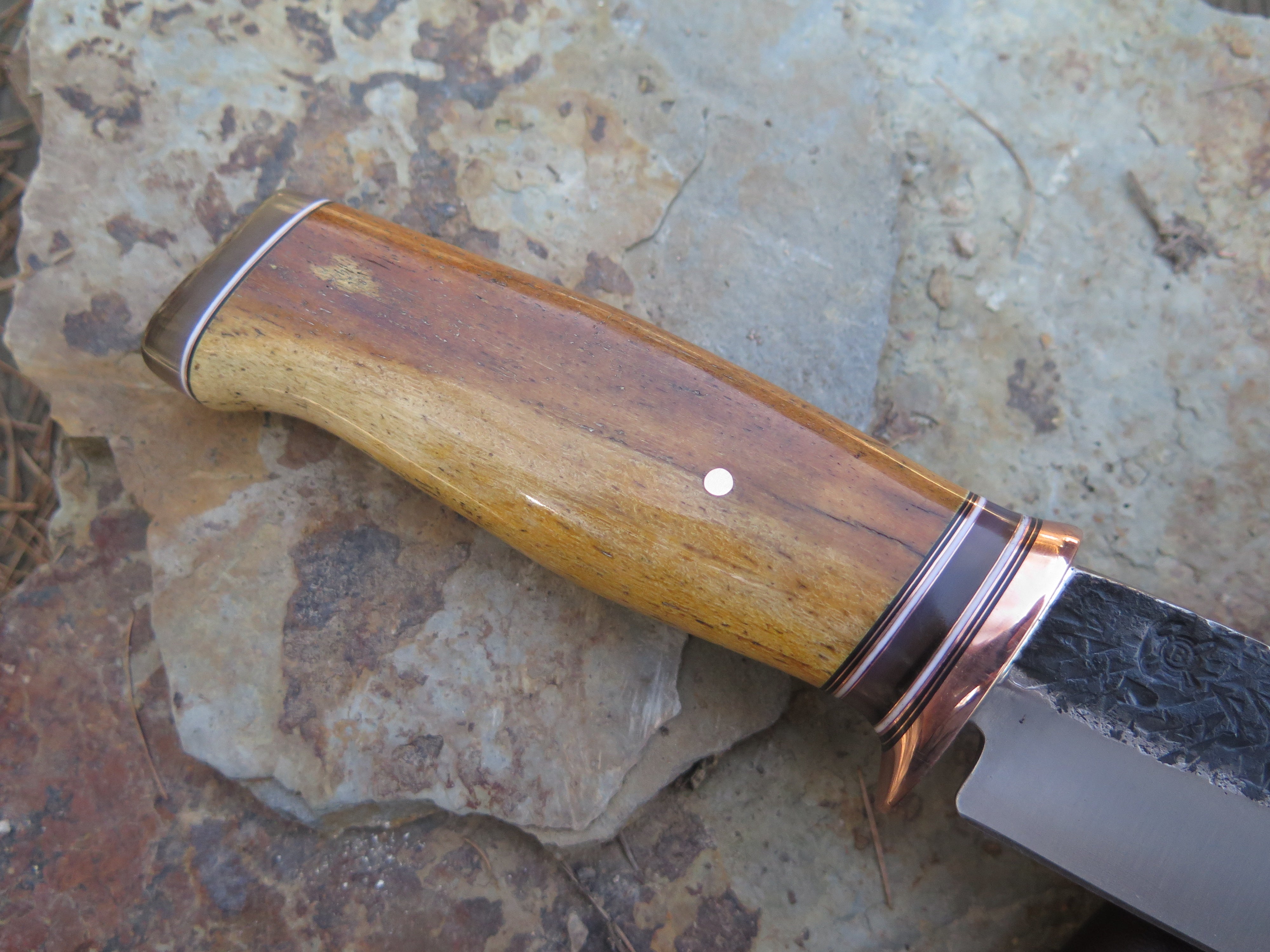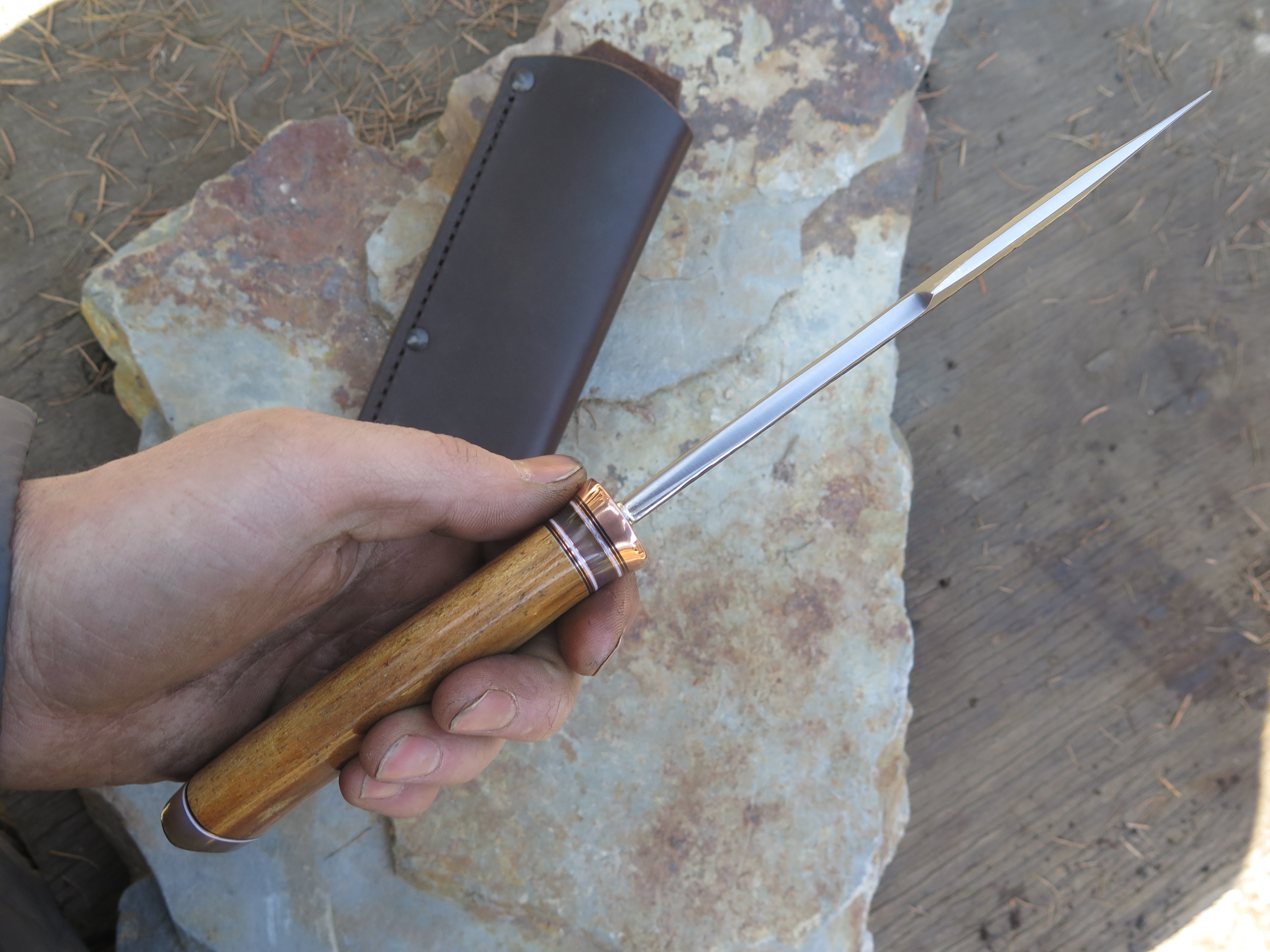 This bad ass new Spearpoint from Behring Made© is hand forged from 13/64" thick 5160 spring steel and it measures 6" from tip to guard with a razor sharp hollow grind and our hammermark finish. The copper guard is soldered in place above black and white fiber, copper and kudu horn spacers with a Stellar's' sea cow rib bone handle that's pinned with copper and capped with kudu as well. Phew! The overall length measures 10 1/2" and this one comes in a classic leather belt pouch sheath.