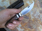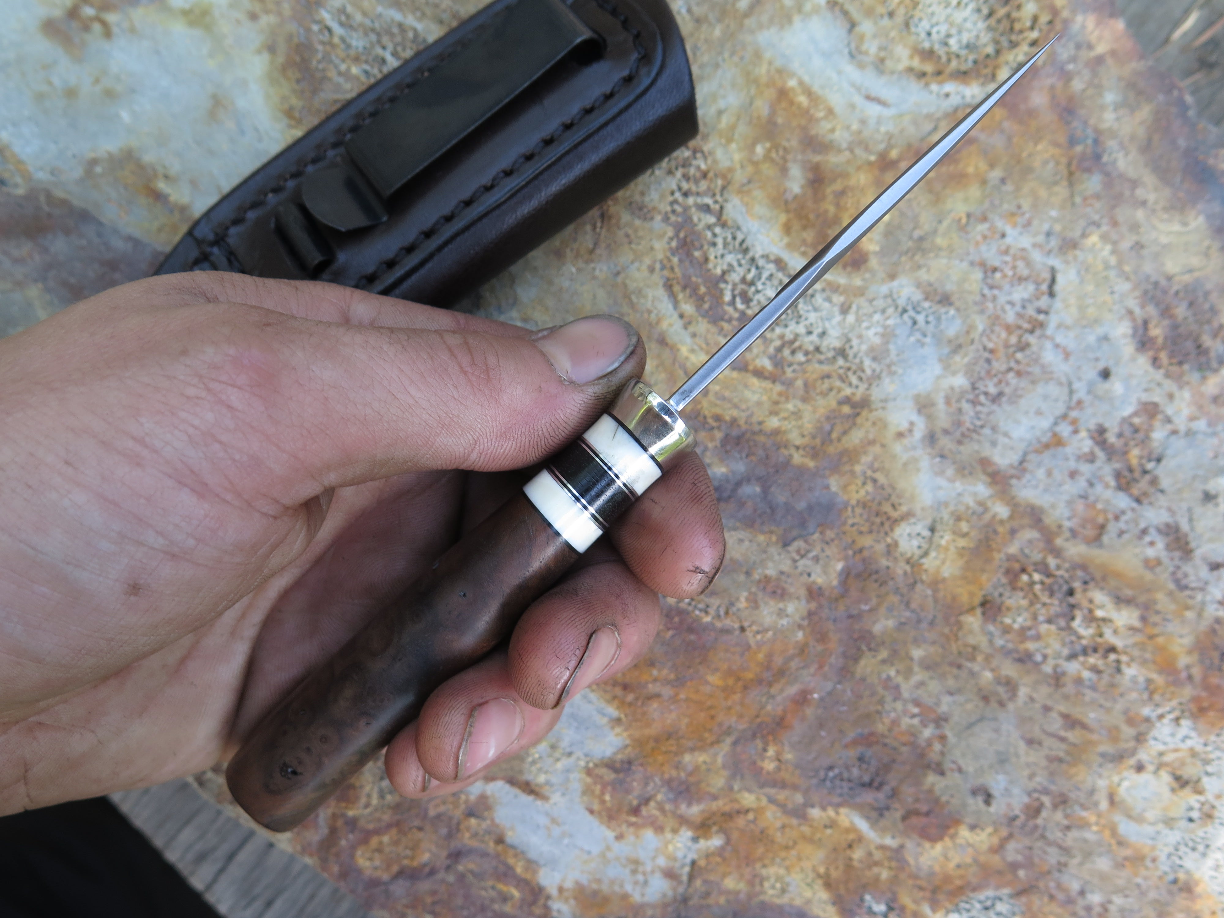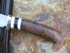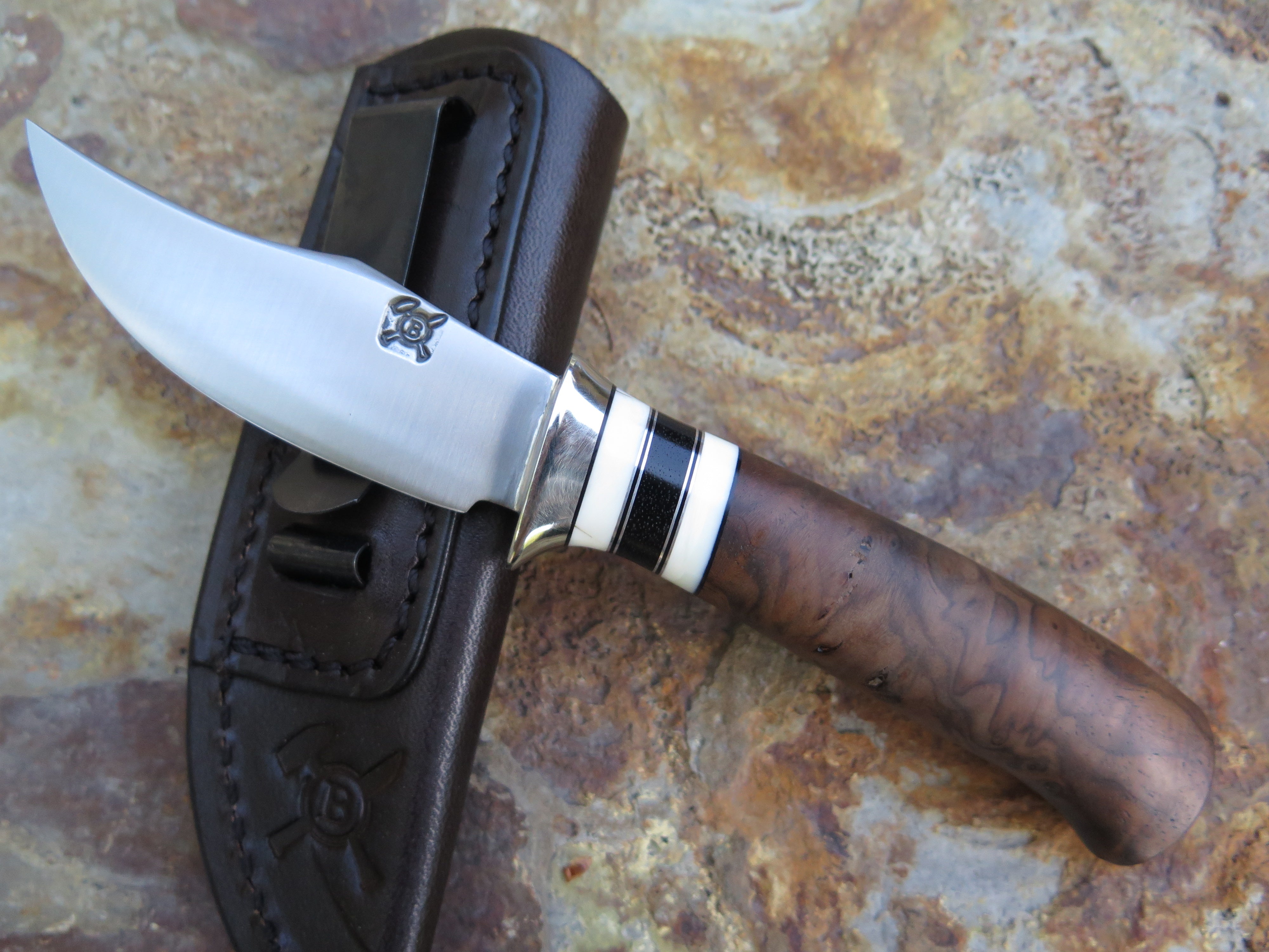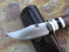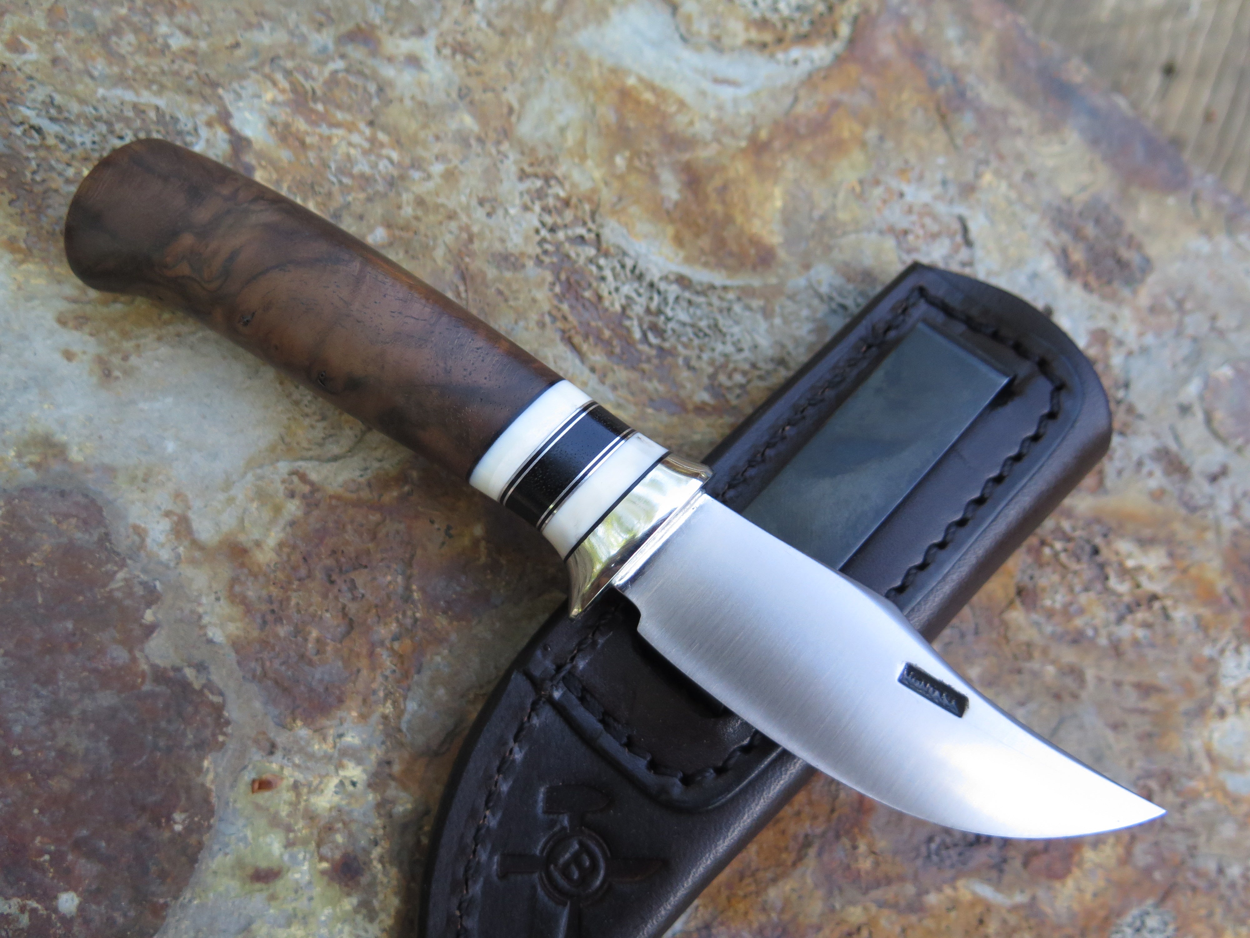 This beautiful new Pocket Knife from Behring Made© is hand forged from 1/8" thick high carbon 01 tool steel and it measures 3" from tip to guard with a razor sharp convex grind. The nickel silver guard is soldered in place above black fiber, aluminum, African ebony, and fossil walrus ivory spacers. The high figure Turkish walnut handle brings the overall length out to 6 3/4" and this one comes in a custom spring clip border tooled pocket clip sheath.