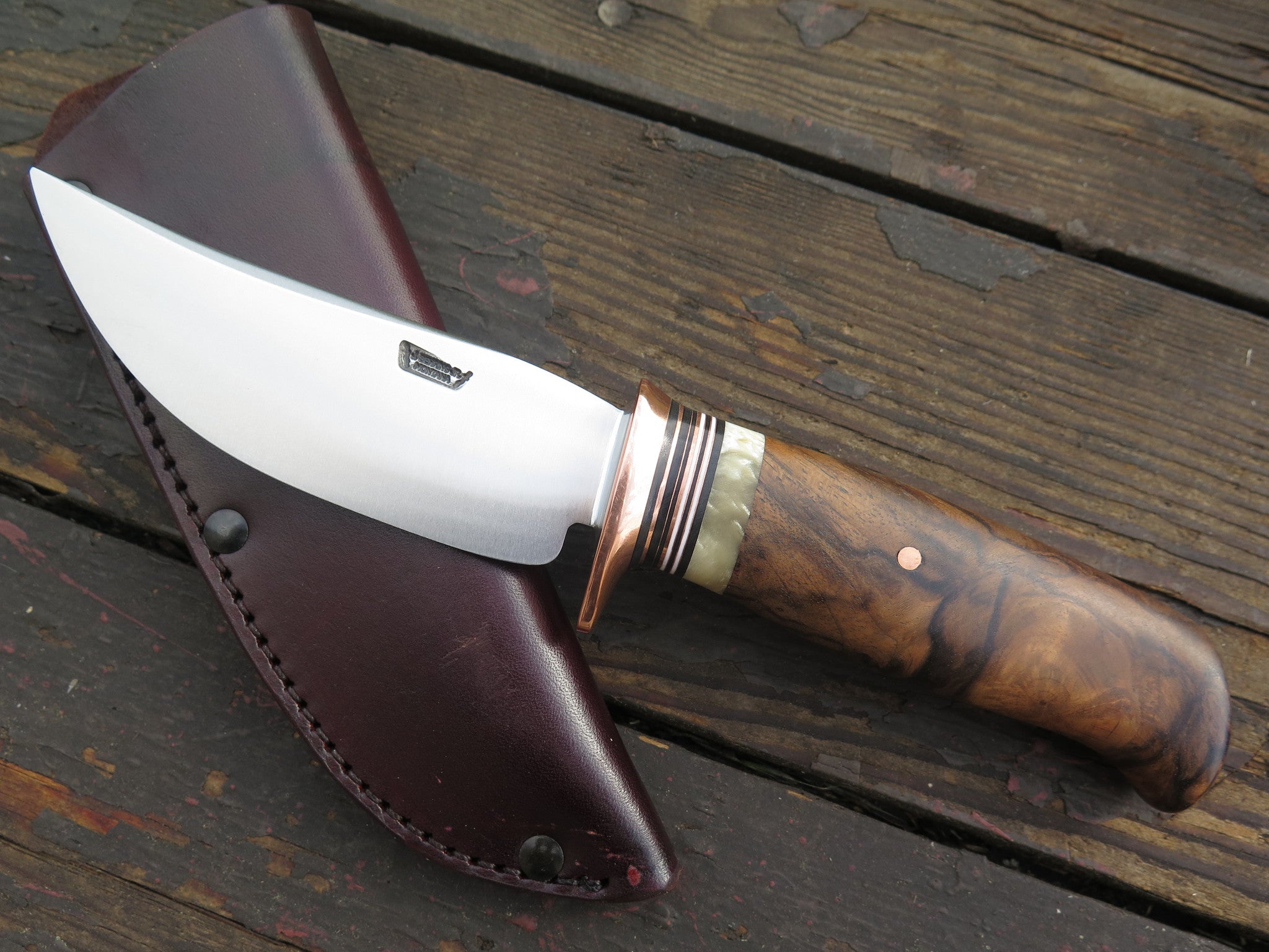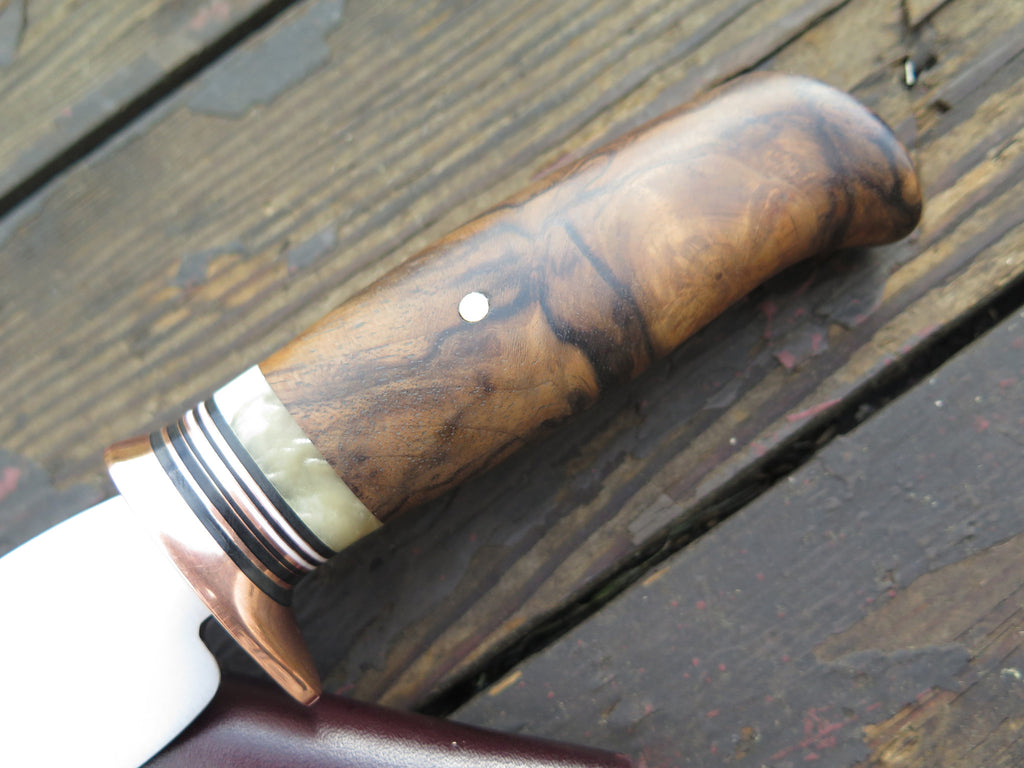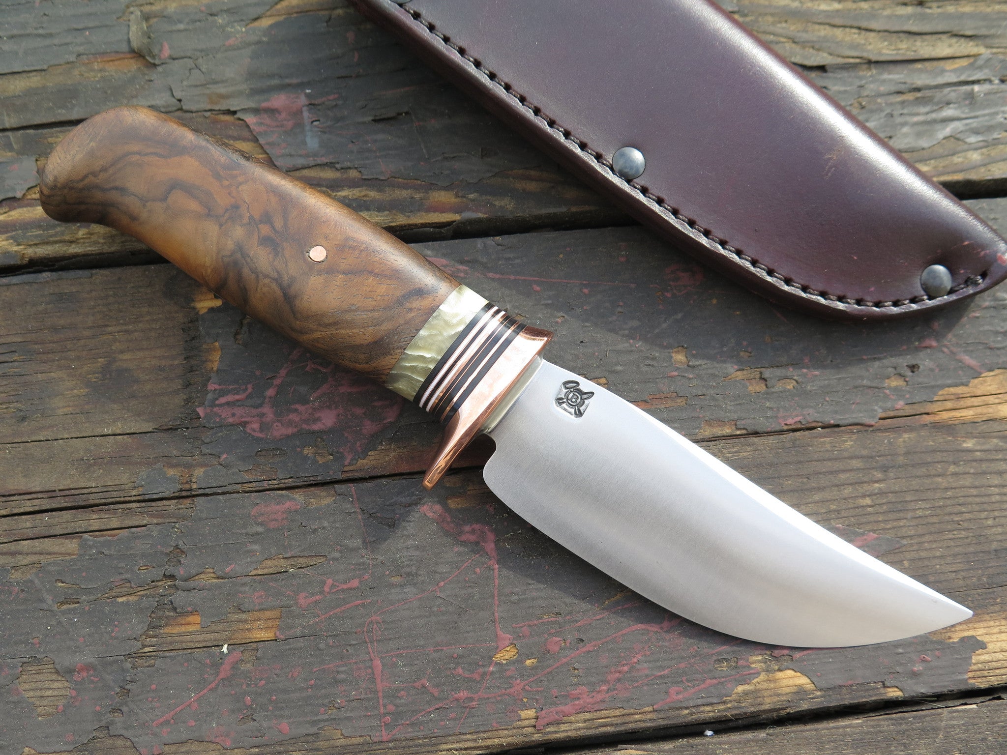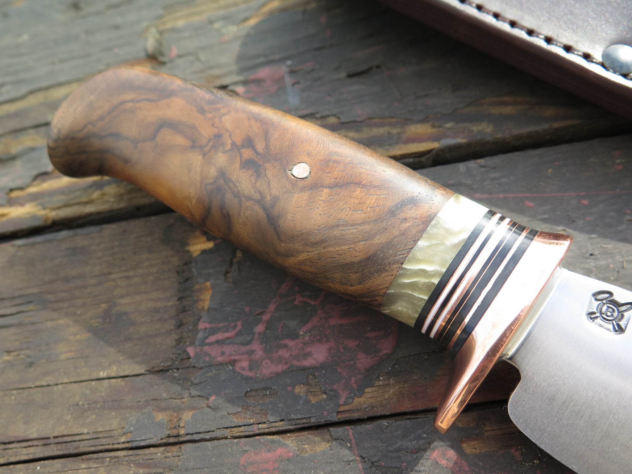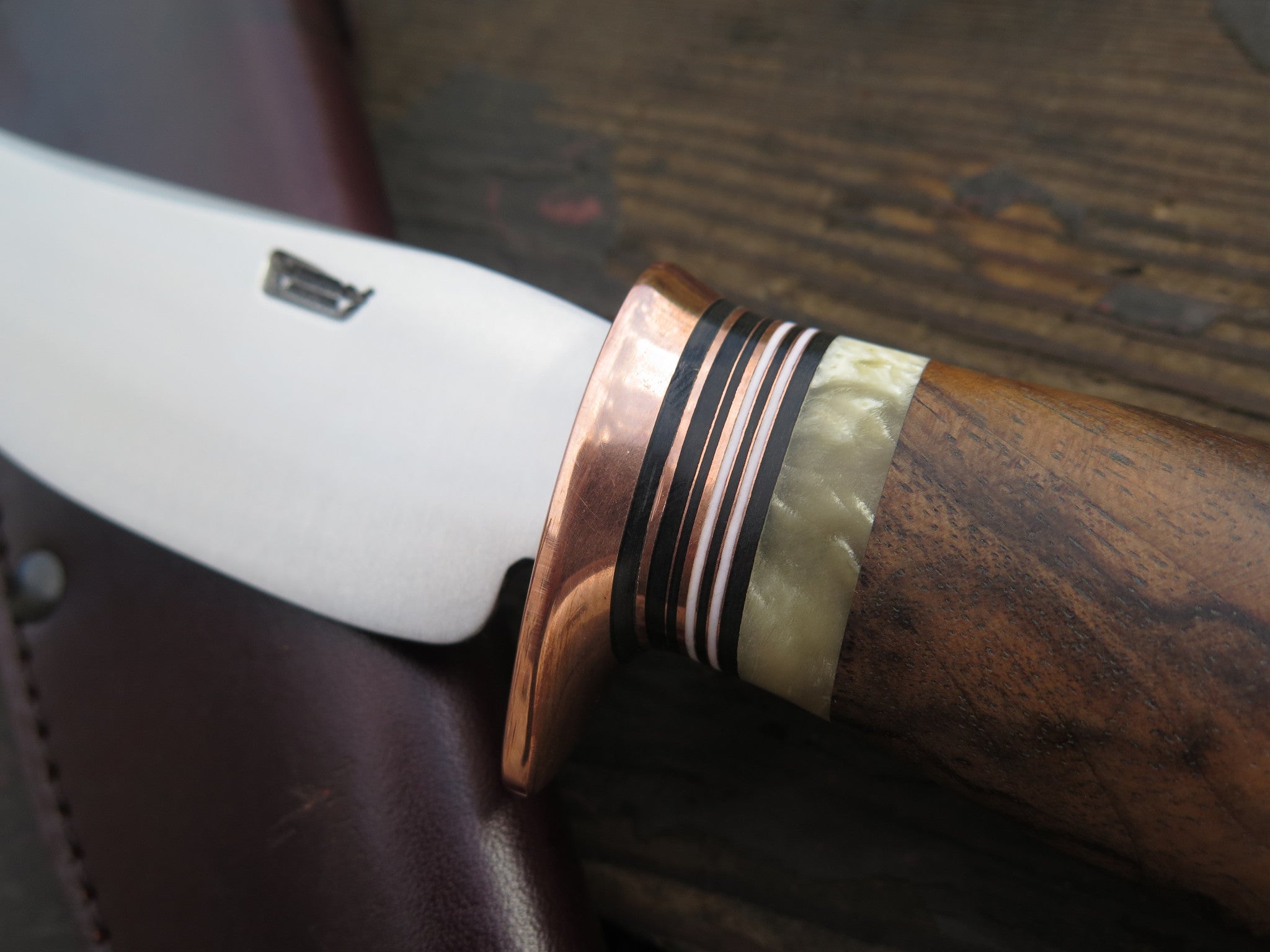 This remarkable hunter from Behring Made is hand forged from high carbon 01 tool steel and it measures 4 3/4" from tip to guard with a razor sharp convex grind. The copper guard is soldered in place above black, copper, white and musk ox boss spacers with a beautiful walnut handle that's pinned with copper. The overall length measures 9 3/8" and it comes in our Behring Made pouch style sheath.