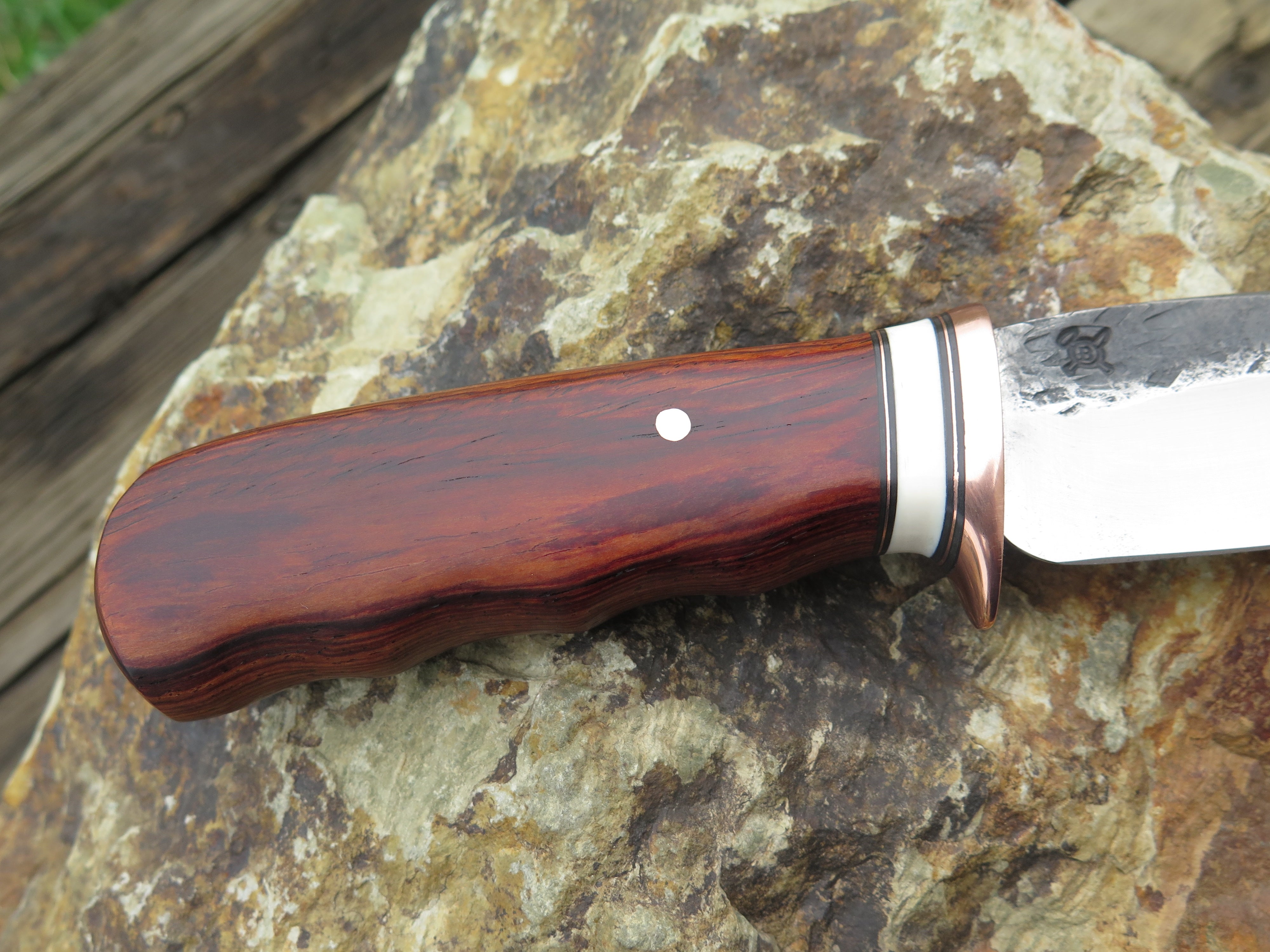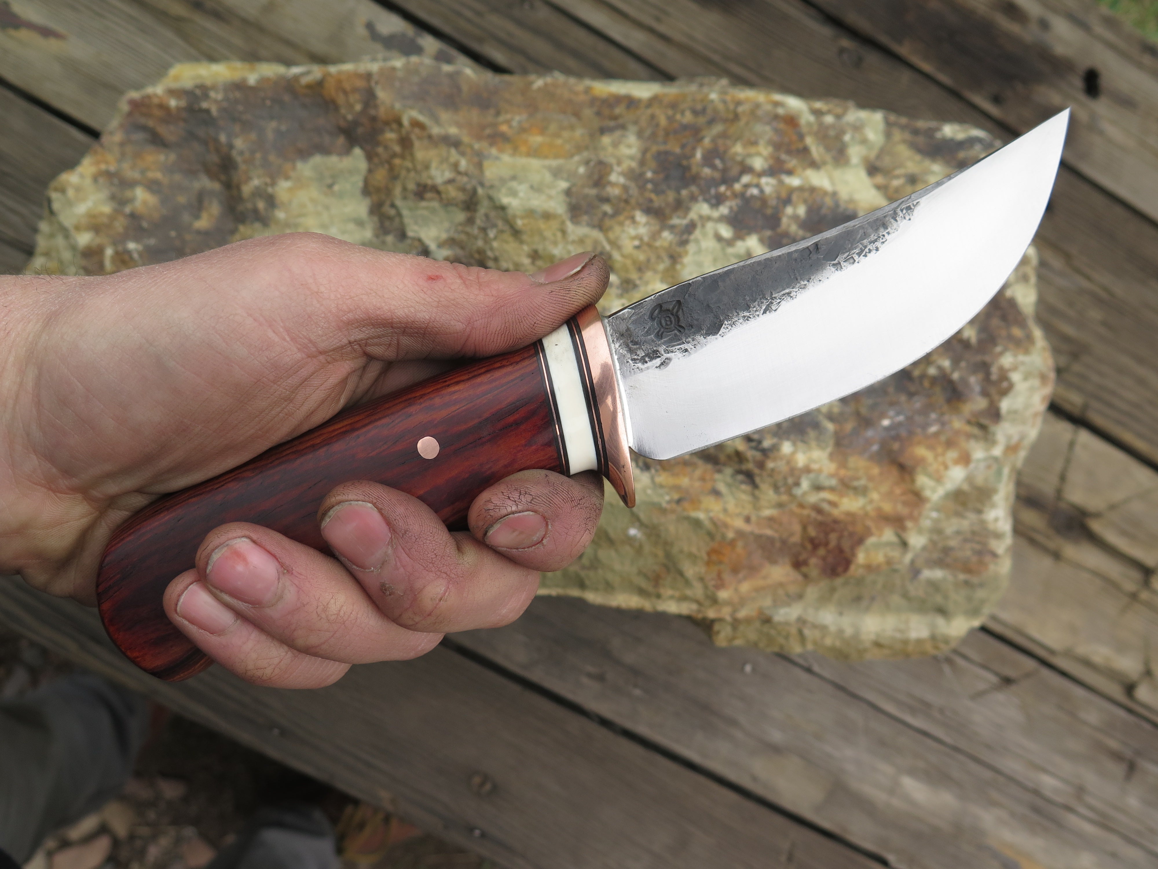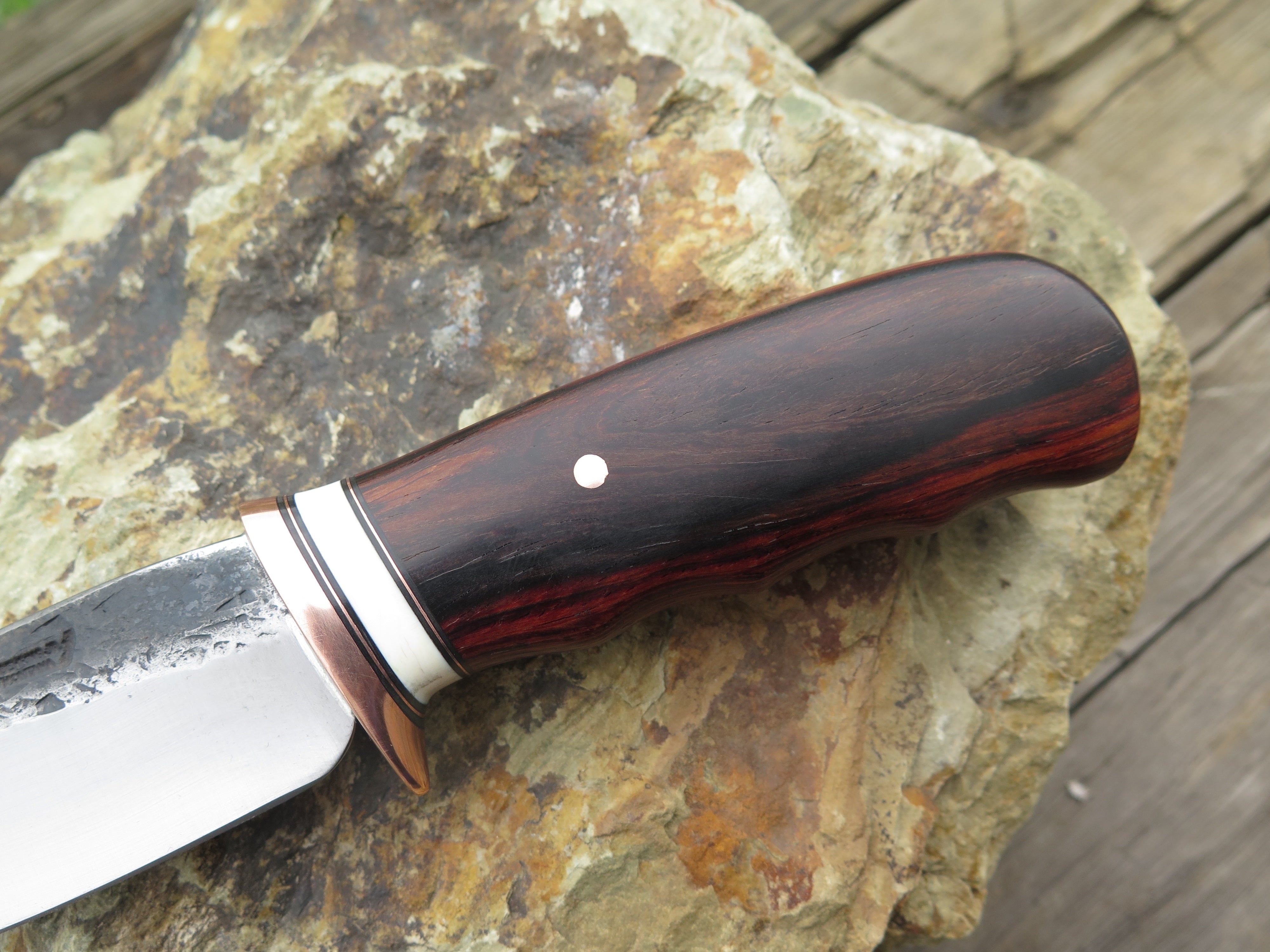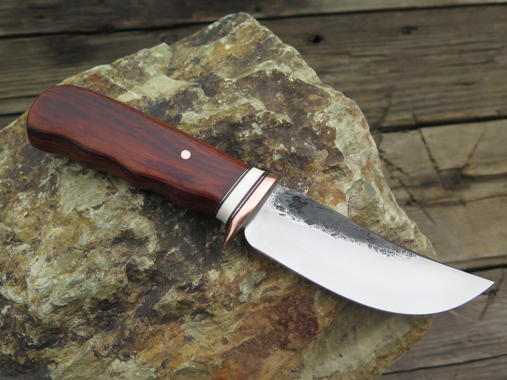 This outstanding new Skinner from Behring Made© is hand forged from 3/16" thick high carbon 01 tool steel and it measures 4 3/4" from tip to guard with a razor sharp hollow grind and our hammermark finish. The copper guard is soldered in place above black fiber and copper spacers with a brilliant walrus ivory accent. The cocobolo handle features a Ward Gay style finger grip shape and we've pinned it through the tang with copper. The overall length measures 9 1/4" and this one will come in a custom leather sheath.