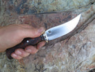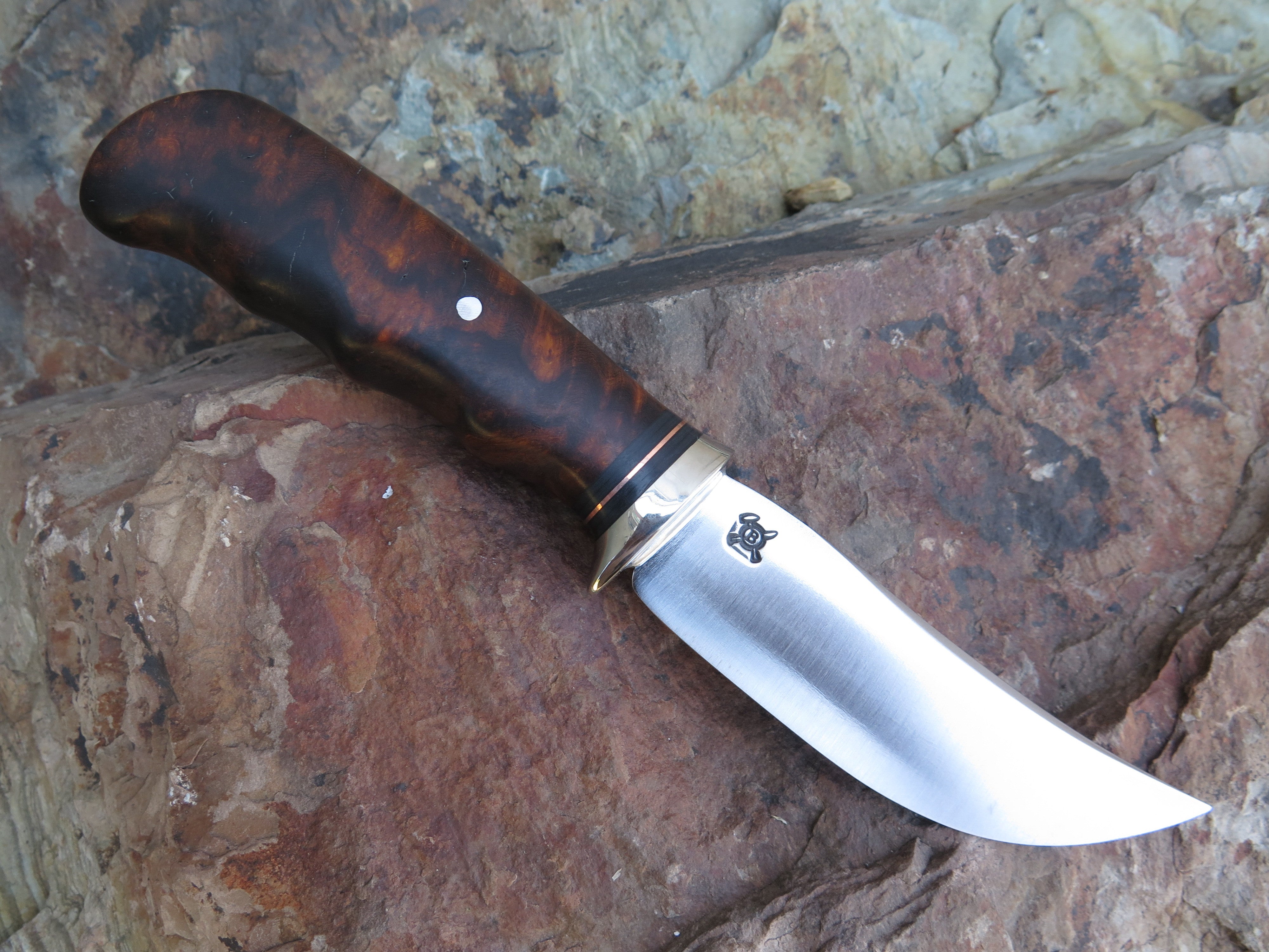 This beautiful new Skinner from Behring Made™ is handmade from 1/8" thick 440c stainless steel and it measures 4" from tip to guard with a razor sharp convex grind. The nickel silver guard is silver soldered in place above black fiber and copper spacers as well as a premium desert ironwood handle that's ground with a Ward Gay style finger grip handle that is also pinned through the tang with aluminum. Overall length measures 8 1/2" and it comes in a custom sheath from Warlander Leather.