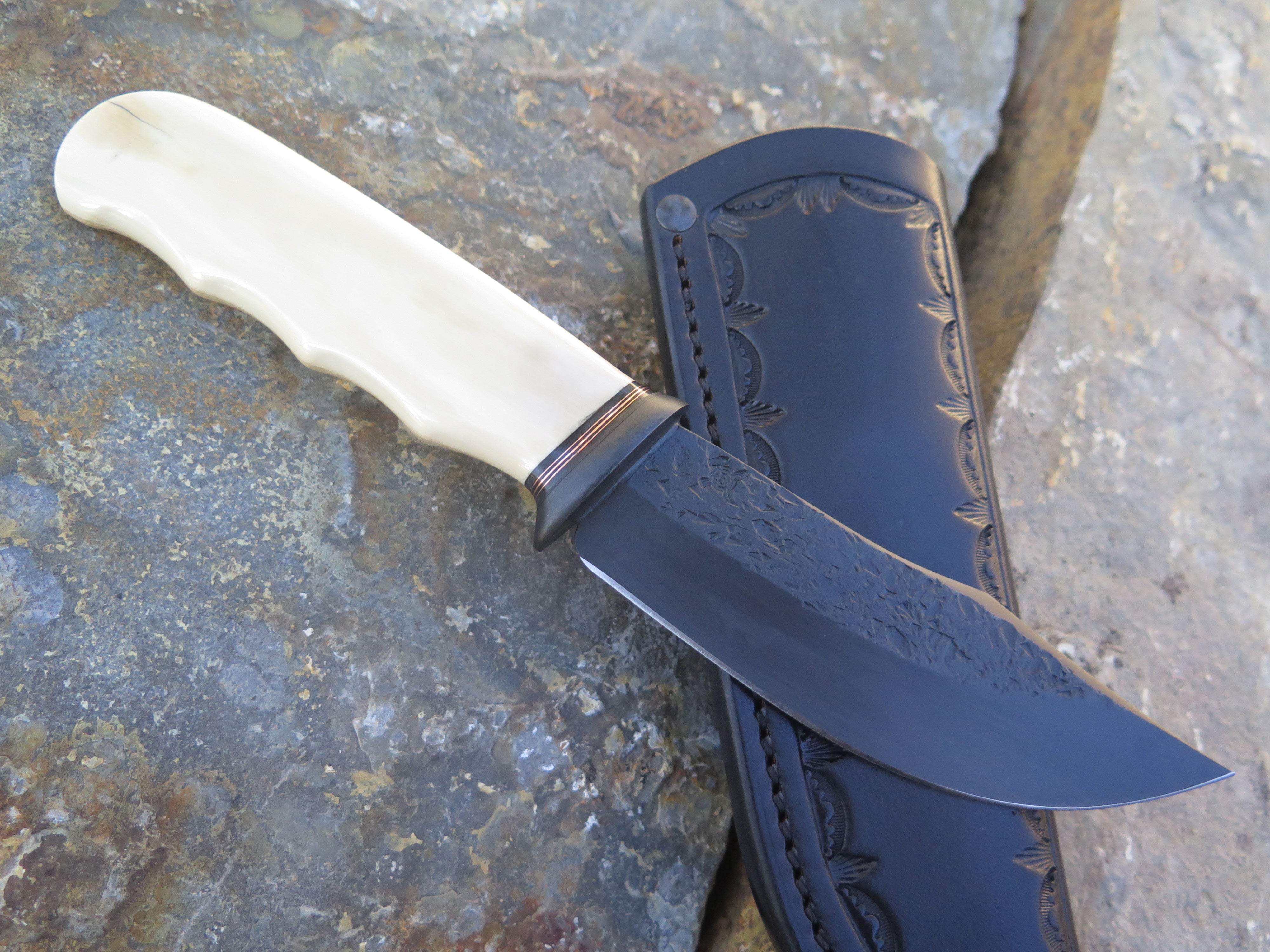 This outstanding new Behring Made© Clip Point is hand forged out of 3/16" thick high carbon 01 tool steel and it measures 4 3/4" from tip to guard with a razor sharp hollow grind, hammermarks and our forced patina blued finish. The blued steel guard is soldered in place above black fiber and copper spacers which top a premium ancient mammoth ivory handle that James ground with a Ward Gay style finger grip. The overall length is just shy of 9 1/2" and this beauty is coming in a custom tooled belt pouch sheath.