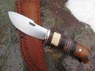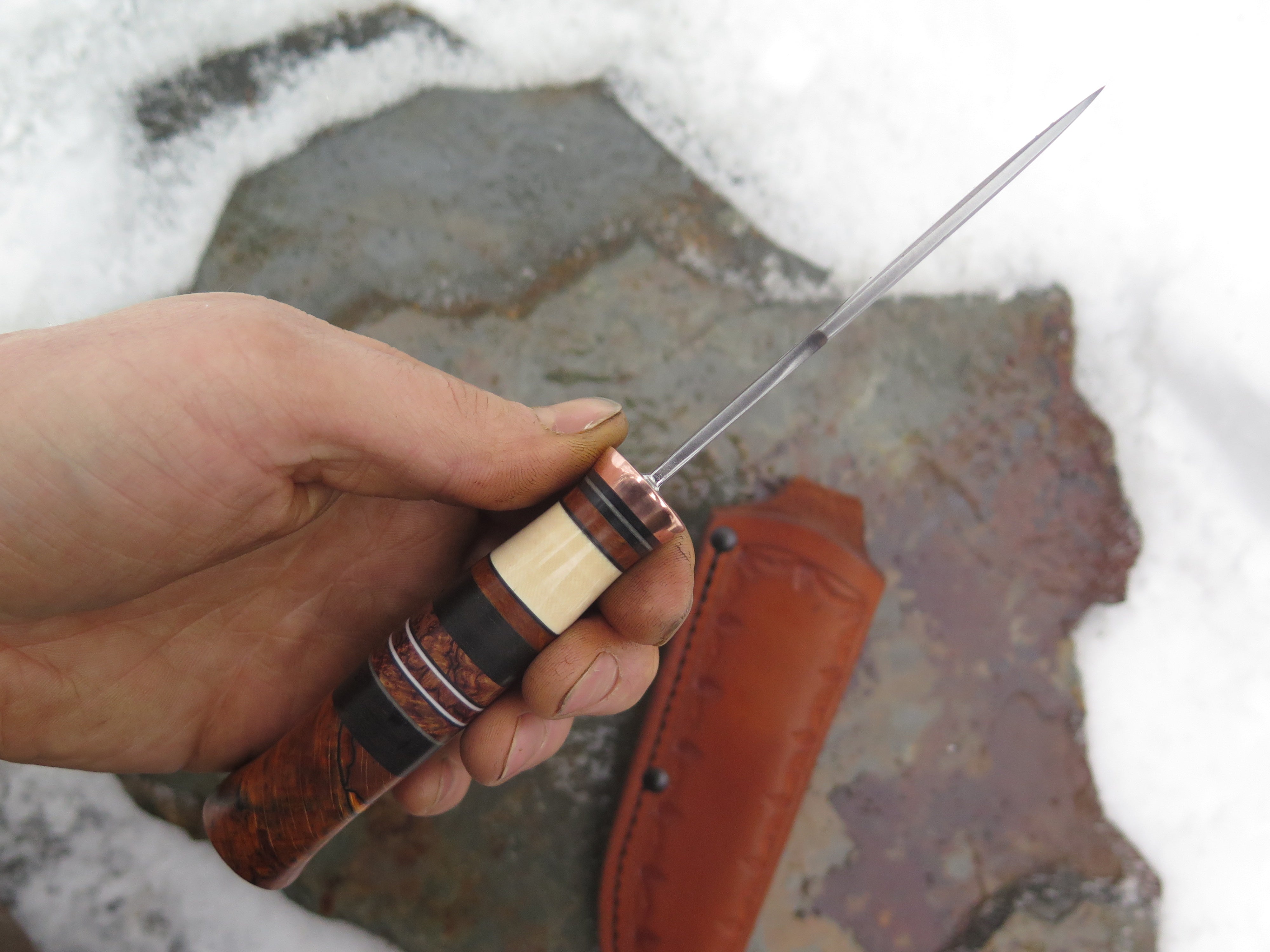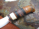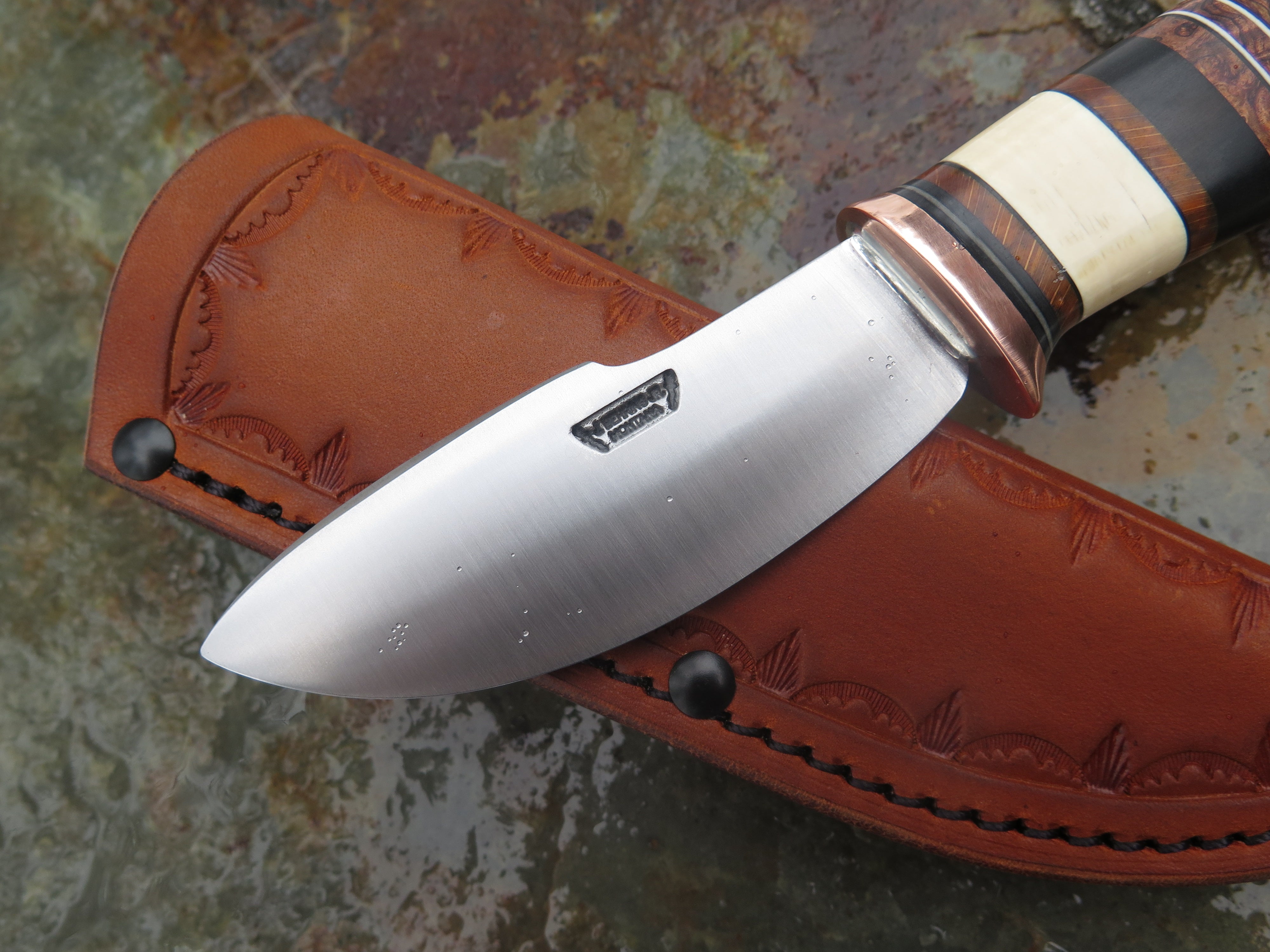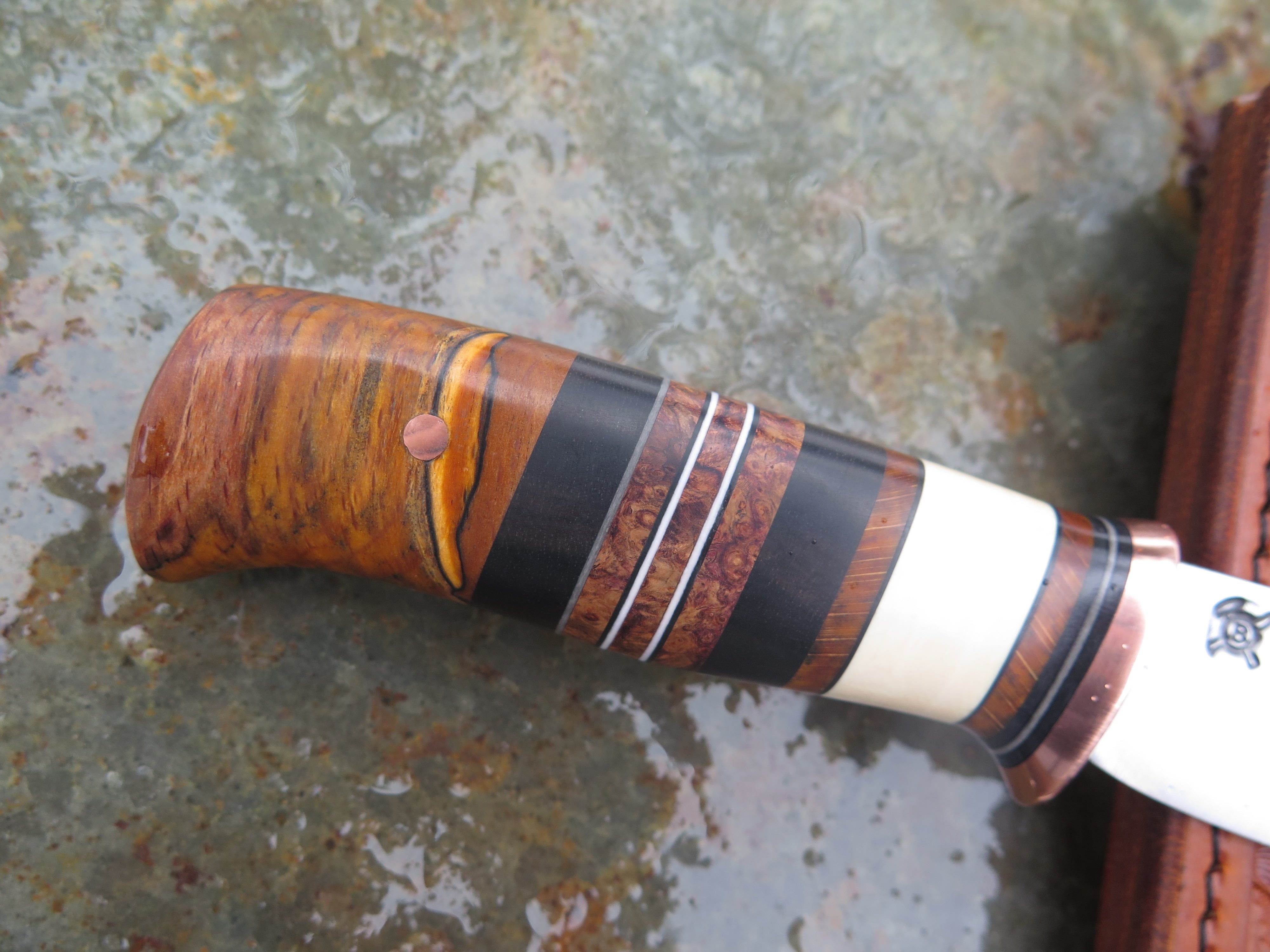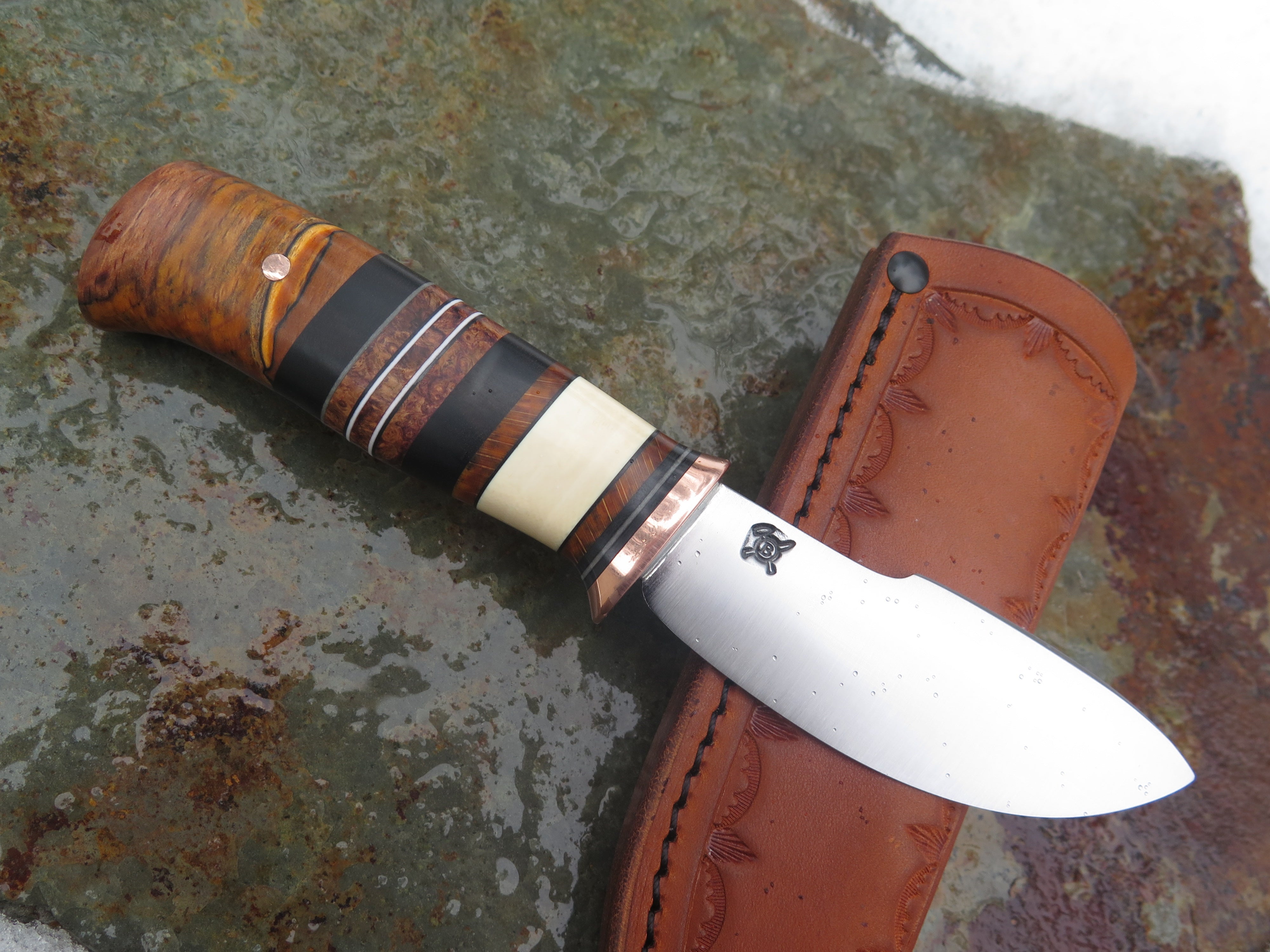This beautiful new Canoe Knife from Behring Made© is hand forged from 1/8" thick high carbon 01 tool steel and measures 3 3/4" from tip to guard with a razor sharp convex grind. The copper guard is soldered in place above black, gray and white fiber and ancient mammoth ivory spacers as well as a woody handle of African ebony, redwood, maple, beech, amboyna and ironwood to boot. The butt is pinned through the tang with copper, and the overall length measures 7 3/4" plus it comes in the shown leather belt pouch sheath, though substitutions are available upon request.