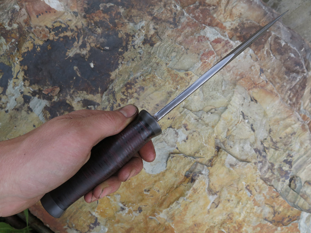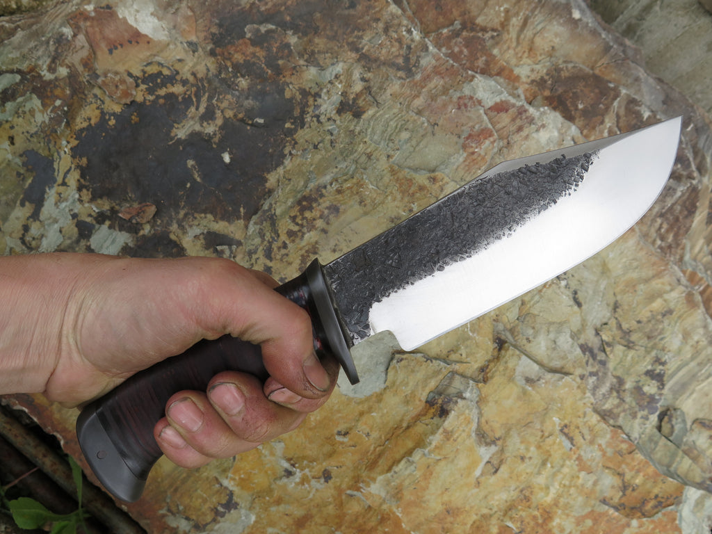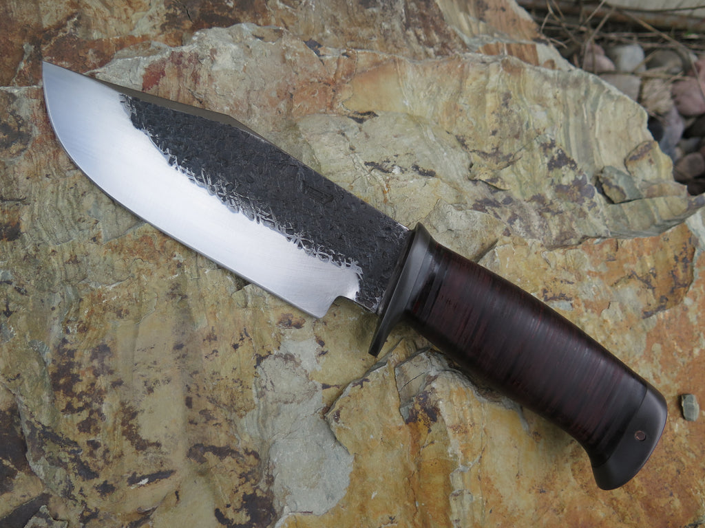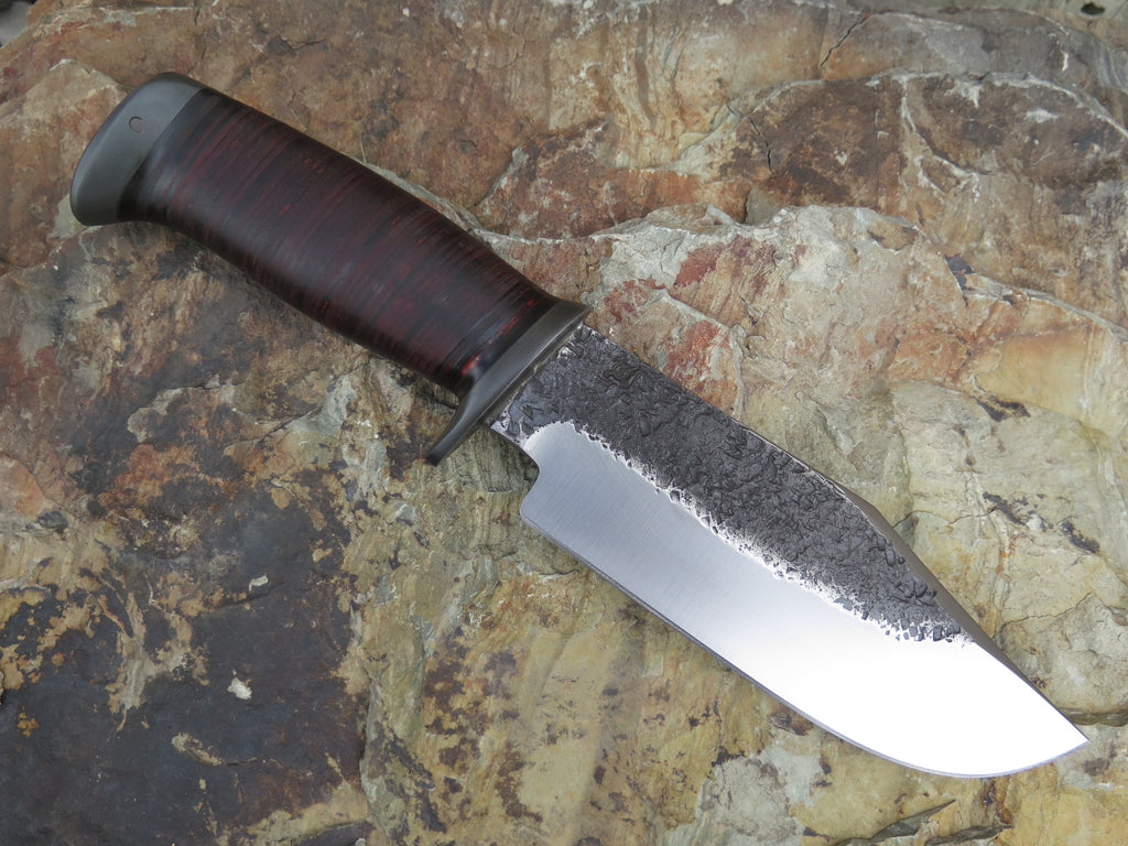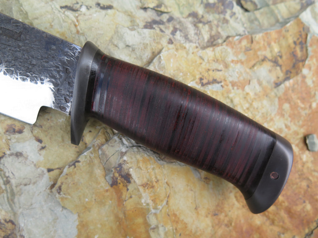 Undeniably bad ass, this Bushmaster from Behring Made™ is hand forged from 1/4" thick high carbon 01 tool steel and it means serious business with a razor sharp hollow grind that measures 6 1/2" from tip to guard with our hammermark finish. The blued steel guard is soldered in place above a WWII inspired handle of stacked horsehide leather and black fiber that's also capped with blued steel and a copper pin. The overall length measures 11 1/4" and it comes in a custom sheath from Behring Made Leather. 6-8 week lead time.