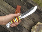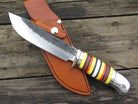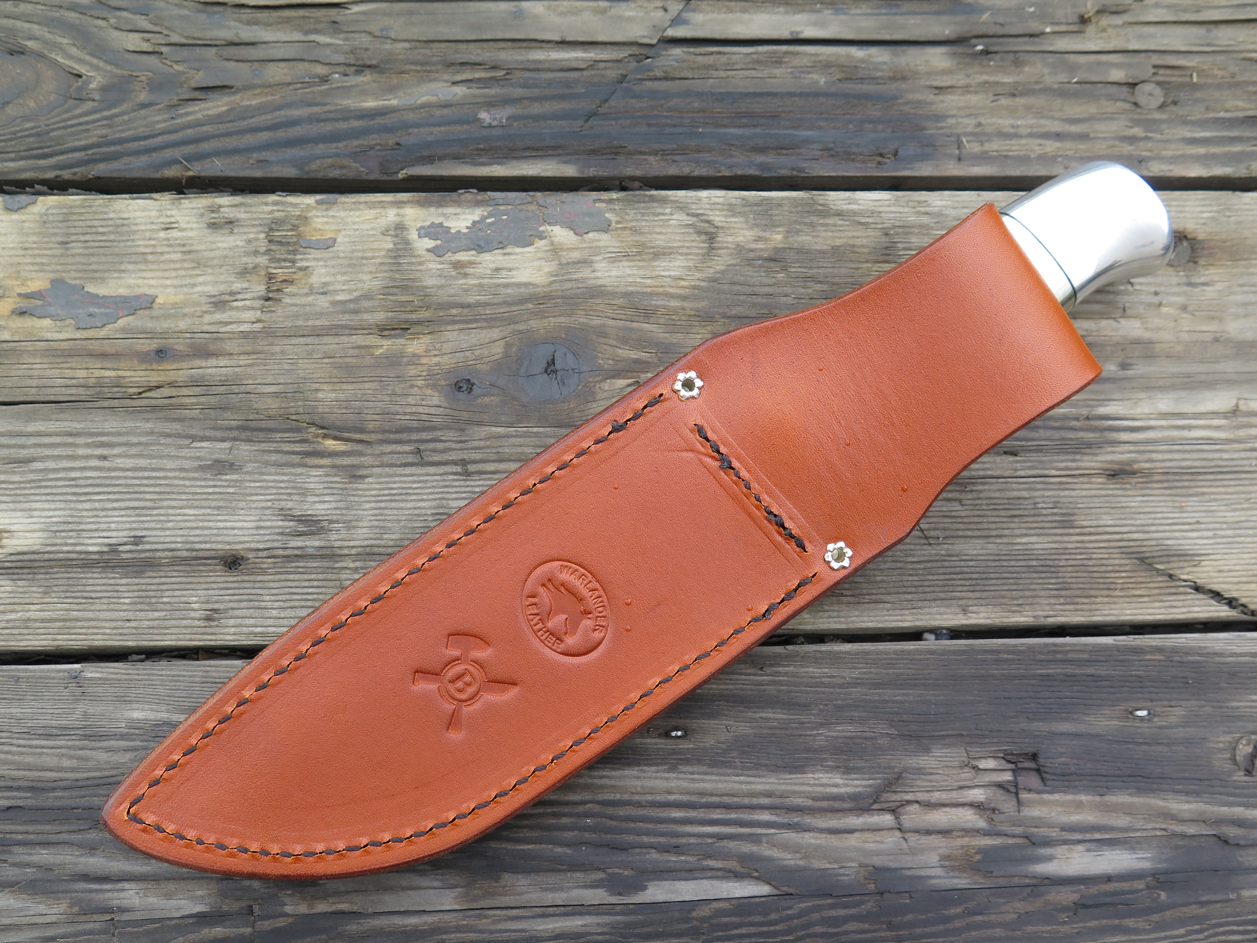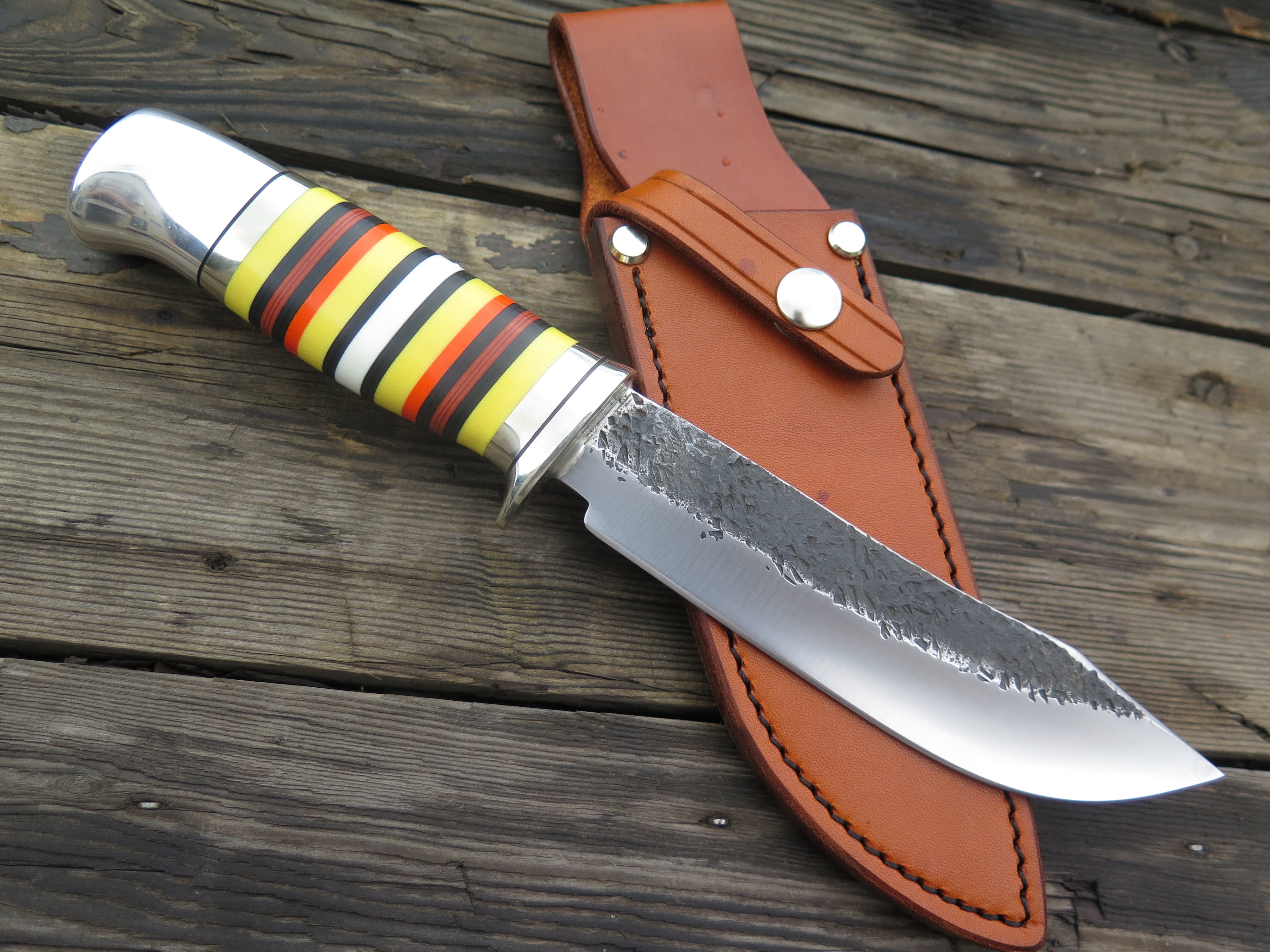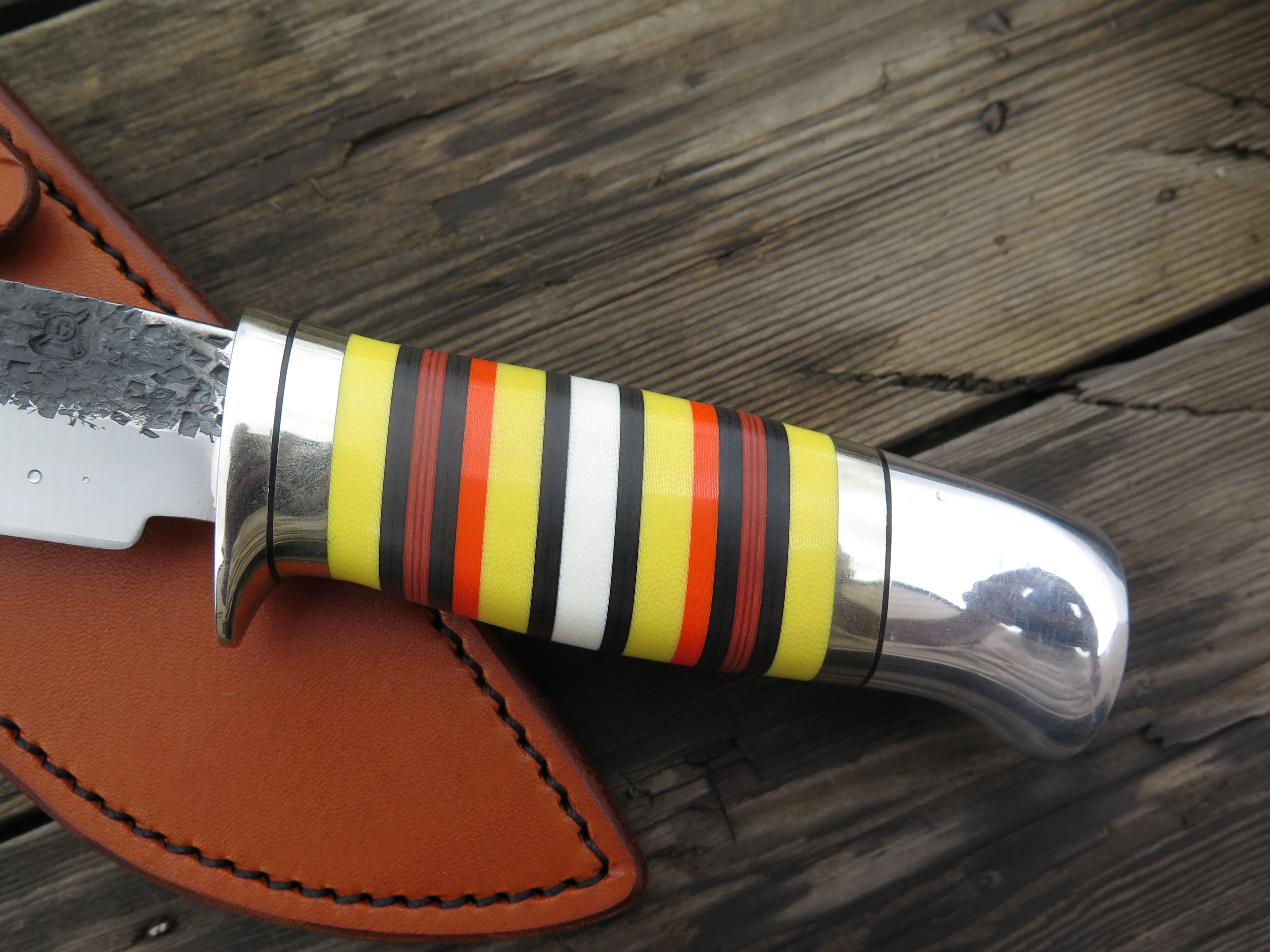 This incredible new offering from Behring Made© comes with quite the backstory. I received a phone call several months ago, with a horror story from a gentleman about a knife his great uncle had gifted him as a youth. It was one of a small set of WWII theater knives that had been given to he and his cousins and carried then for a lifetime- that is until his knife was stolen during a home remodel. He'd had but one photo of the original and from this James and I were able to recreate this tribute knife for him. The blade is hand forged from 13/64" and measures 6" from tip to guard with a razor sharp hollow grind and our hammermark finish. The nickel silver guard is soldered in place above black fiber, aluminum, white, yellow and orange G10, black and maroon fiber spacers with a big aluminum butt that's pinned with aluminum. The overall length measures 10 3/4" and it comes in a custom sheath from Warlander Leather.