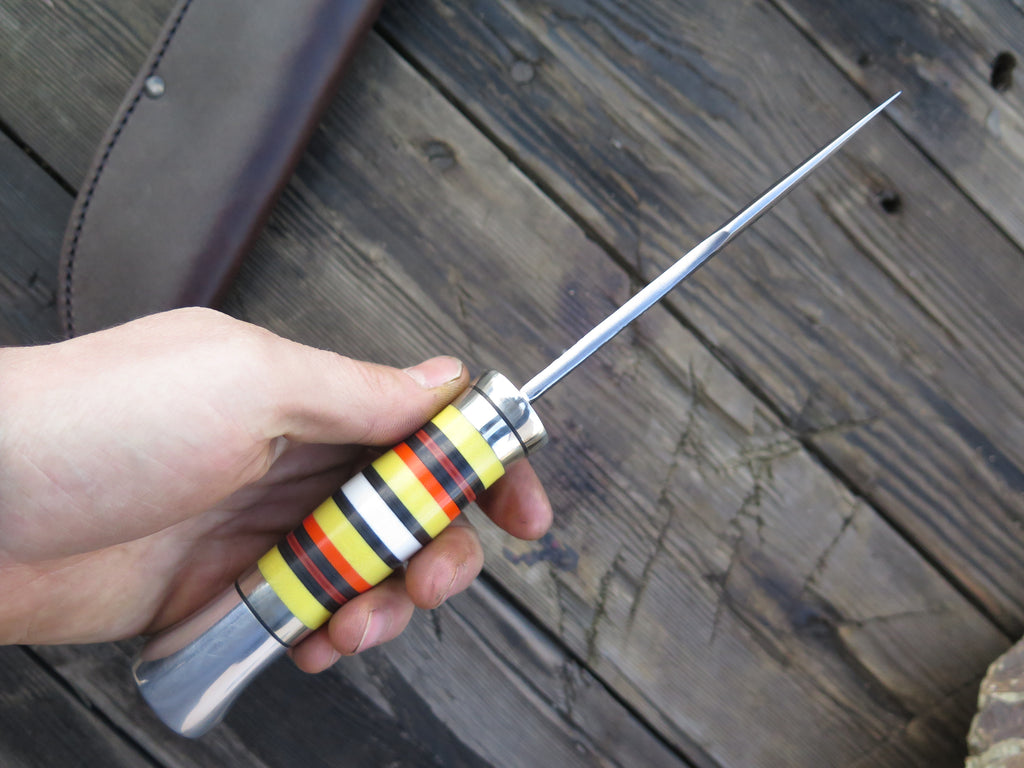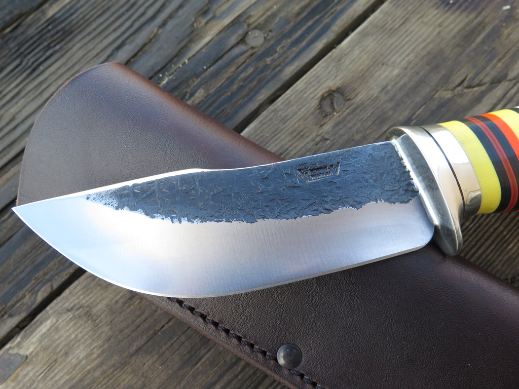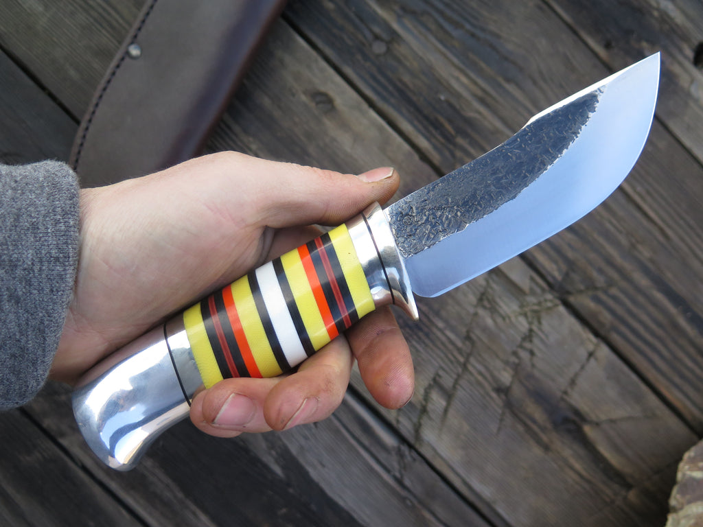 This incredible new Woodcraft from Behring Made© is a tribute to the theater knives made my deployed military personnel during wartime. They would typically source whatever scrap materials were available for handles and the outcomes were often bright and beautiful. The one is hand forged from 3/16" thick high carbon 01 tool steel and it measures 4 1/2" from tip to guard with a razor sharp hollow grind and our hammermark finish. The nickel silver guard is soldered in place above black and maroon fiber with white, orange and yellow g10 spacers above a big aluminum butt that's pinned through the tang with aluminum too. The overall length measures 9 1/2" and it comes in a Warlander Leather pouch sheath.